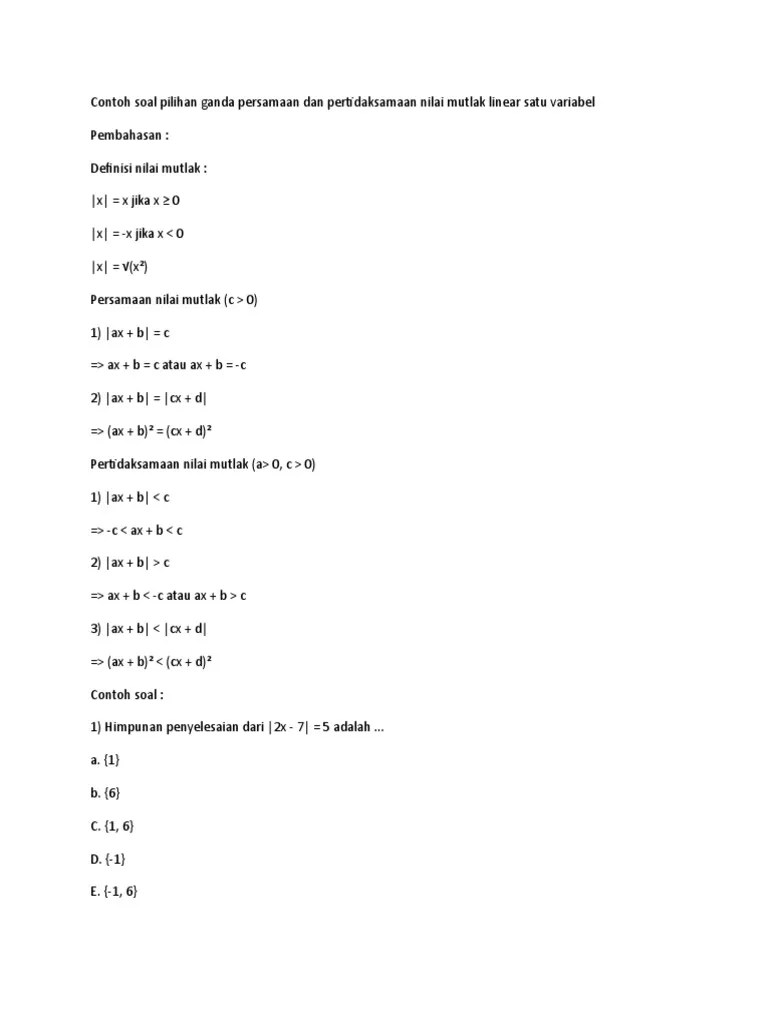Soal Dan Pembahasan Nilai Mutlak Kelas 10 / Cara Menyelesaikan Pertidaksamaan Nilai Mutlak Dilengkapi 20 Soal Latihan Dan Pembahasan Defantri Com : Hello semuanya, kembilly lagi bersama billykur :ddi video kali ini, aku membahas tentang materi nilai mutlak kelas 10 sma beserta beberapa .. Tentukan himpunan selesaian dari persamaan: Soal dan pembahasan meliputi konsep nilai mutlak, fungsi nilai mutlak persamaan. Persamaan nilai mutlak adalah persamaan yang memuat variabel di dalam tanda mutlak. Nilai mutlak adalah suatu bilangan dengan nilai yang.✓ berikut rumus dan contoh soal persamaan dan pertidaksamaan mutlak + pembahasannya. Misalkan x bilangan real, |x| dibaca nilai mutlak x akan didefinisikan :